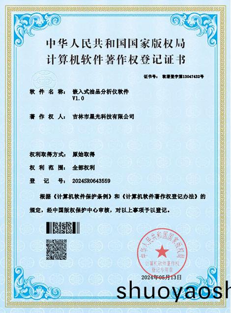 我公司(吉林市星光科技有限公司)油品分析仪器通过多指标检测,实现多种指标集成,并取得中华人民共和国国家版权计算机软件著作权,为仪器使用与测量等提供有力保障。