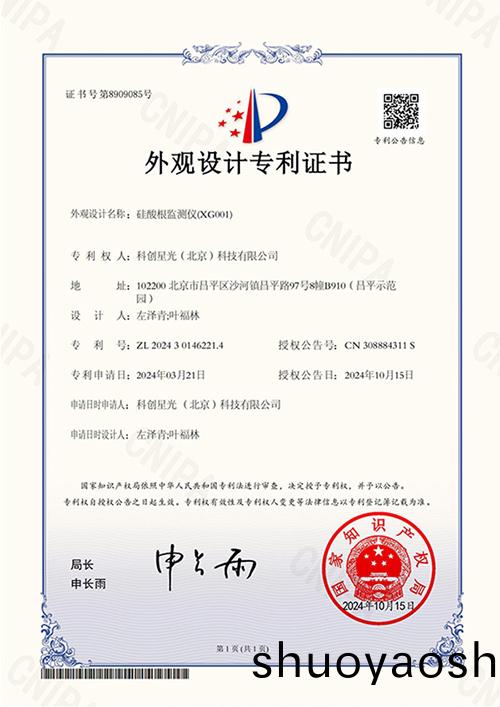 喜讯!科创星光 XG001型硅酸根监测仪--荣获外观设计专利证书!