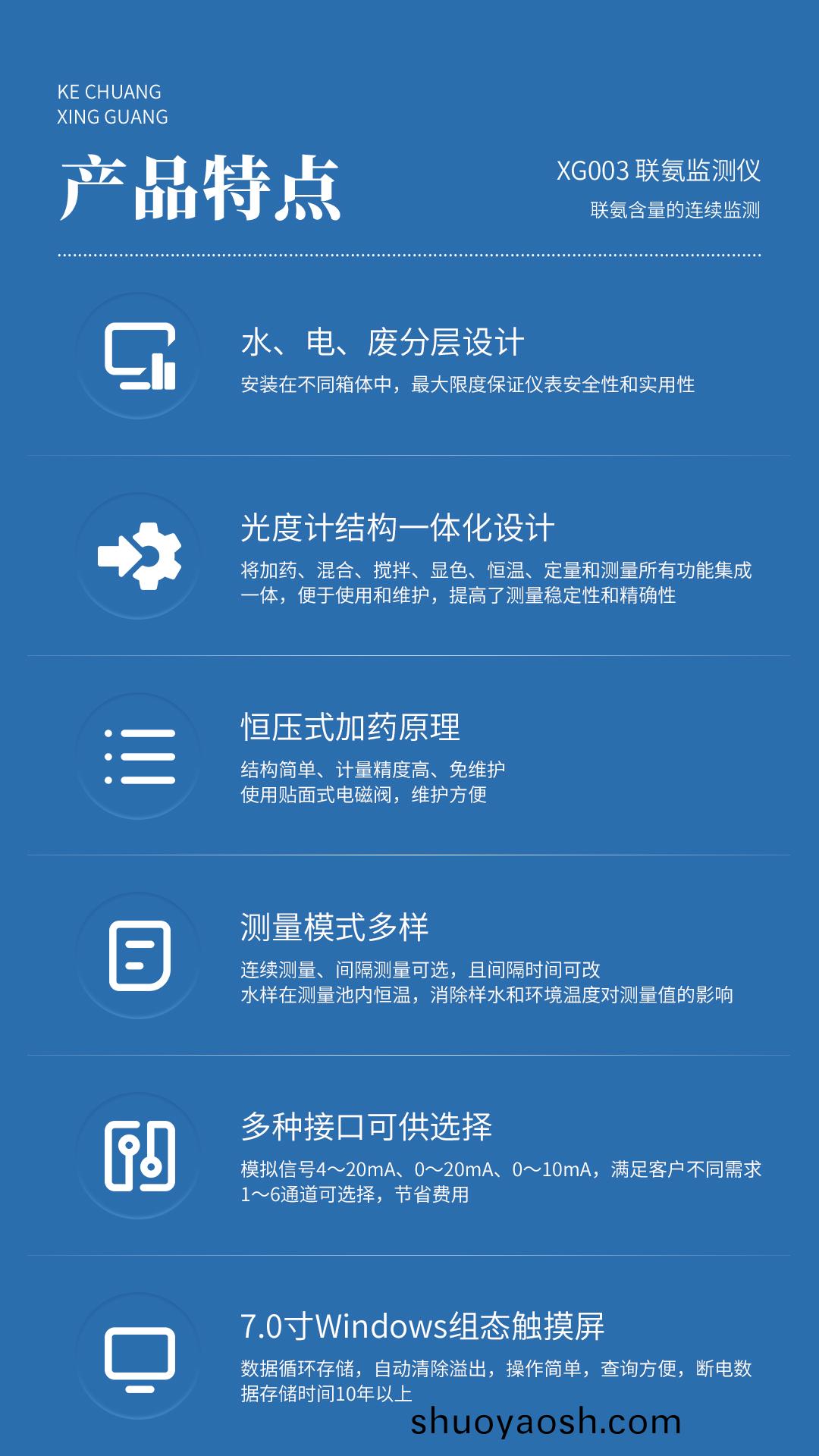 XG003型 联氨监测仪 采用先进光电子技术设计制造。该仪器符合GB/T6906《锅炉用水和冷却水分析方法联氨的测定》标准,可广泛应用于电力、化工、冶金、环保、制药、半导体和自来水等行业溶液中联氨含量的连续监测。