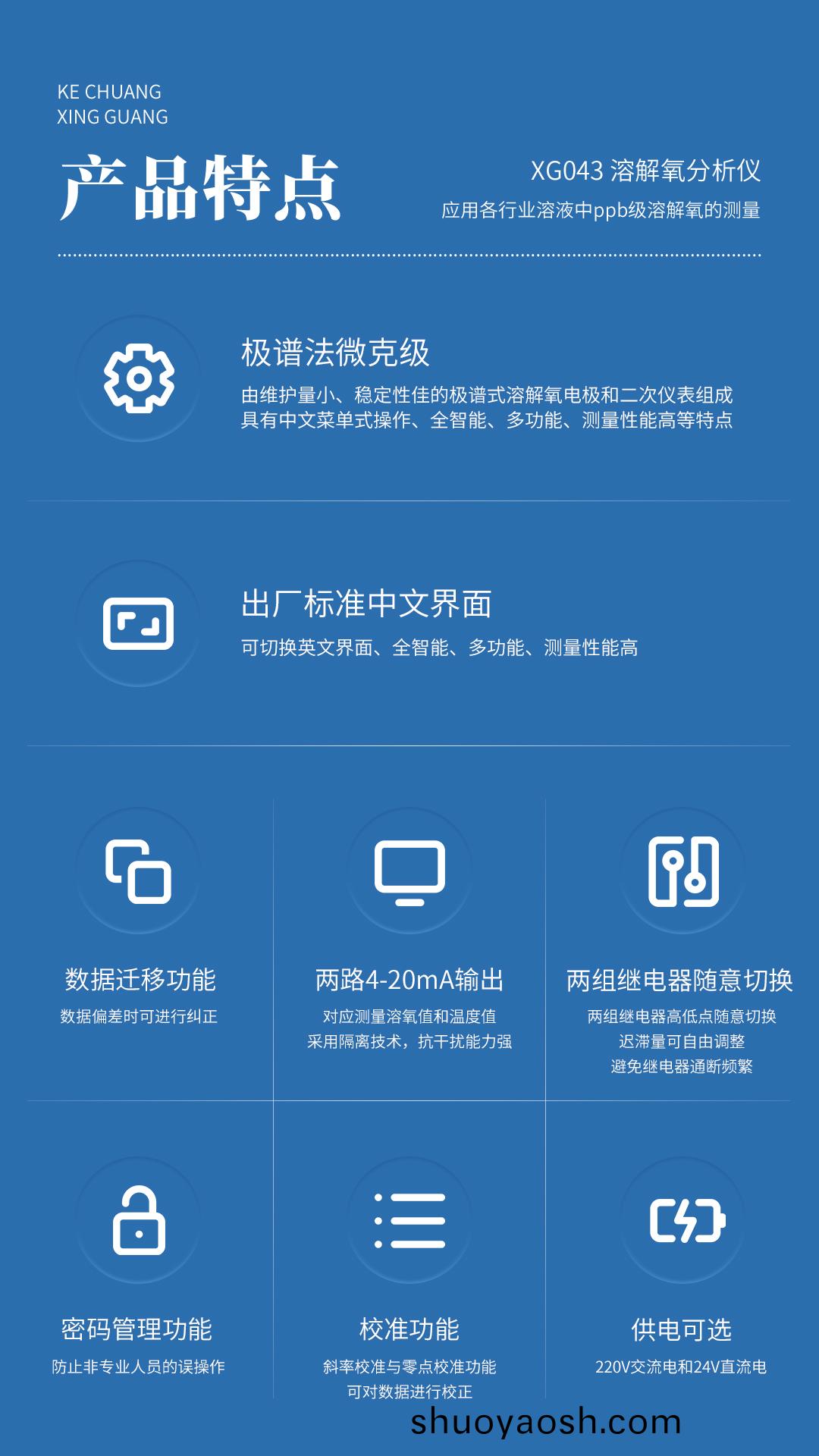 XG043溶解氧分析仪(极谱法微克级) 由维护量小、稳定性佳的极谱式溶解氧电极和二次仪表组成,具有中文菜单式操作、全智能、多功能、测量性能高等特点,广泛应用各行业溶液中ppb级溶解氧的测量。