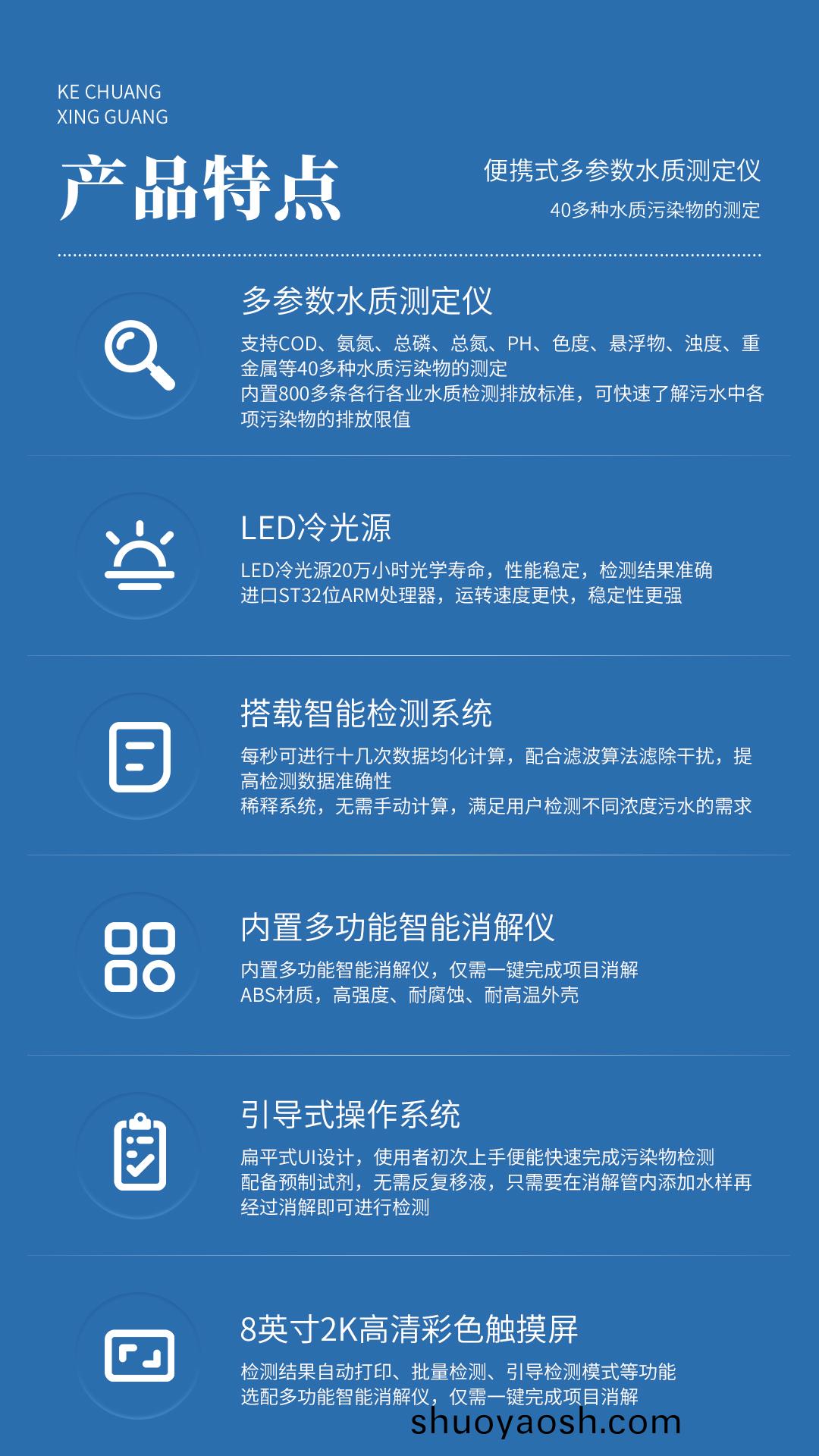 ● 支持COD、氨氮、总磷、总氮、PH、色度、悬浮物、浊度、重金属等40多种水质污染物的测定。