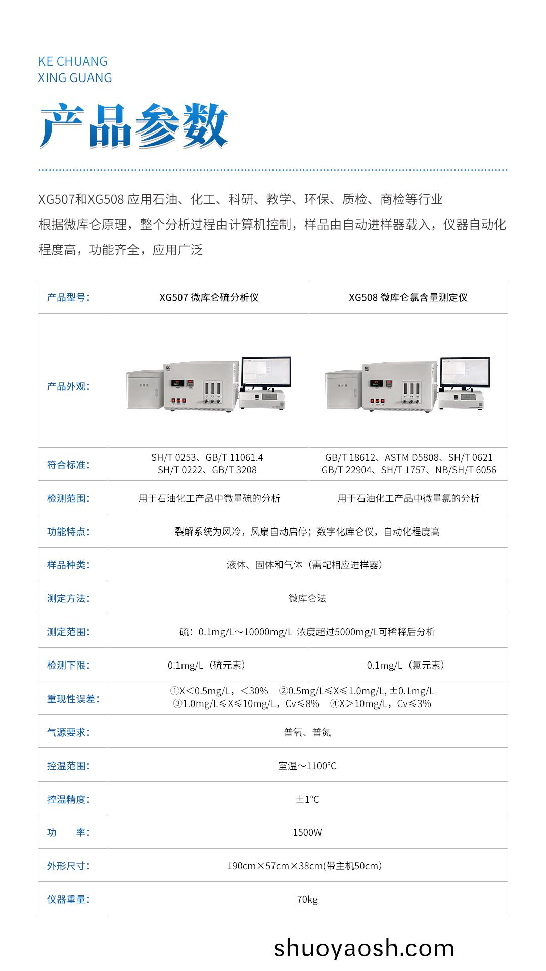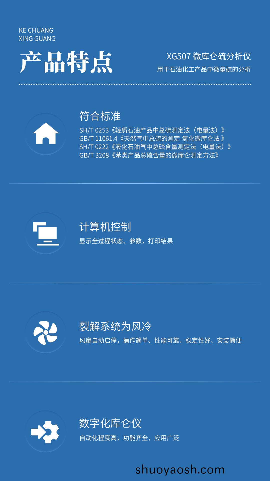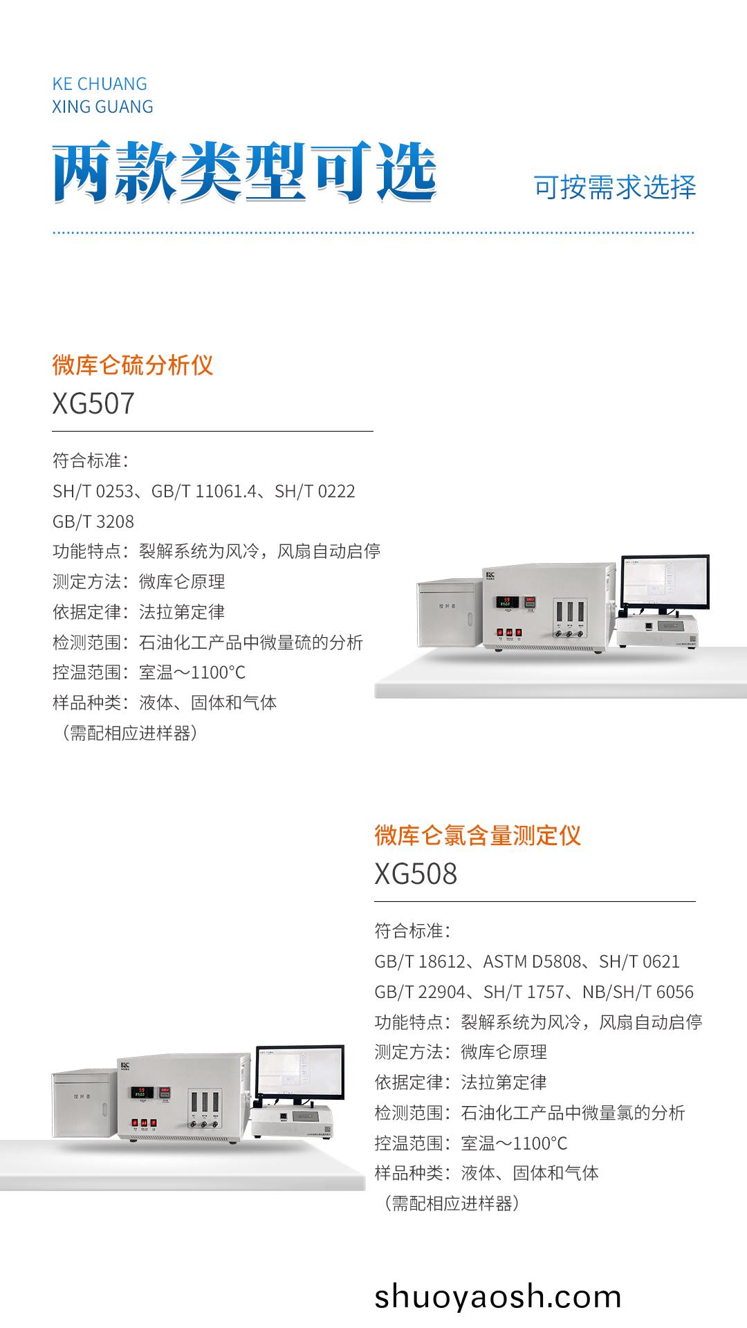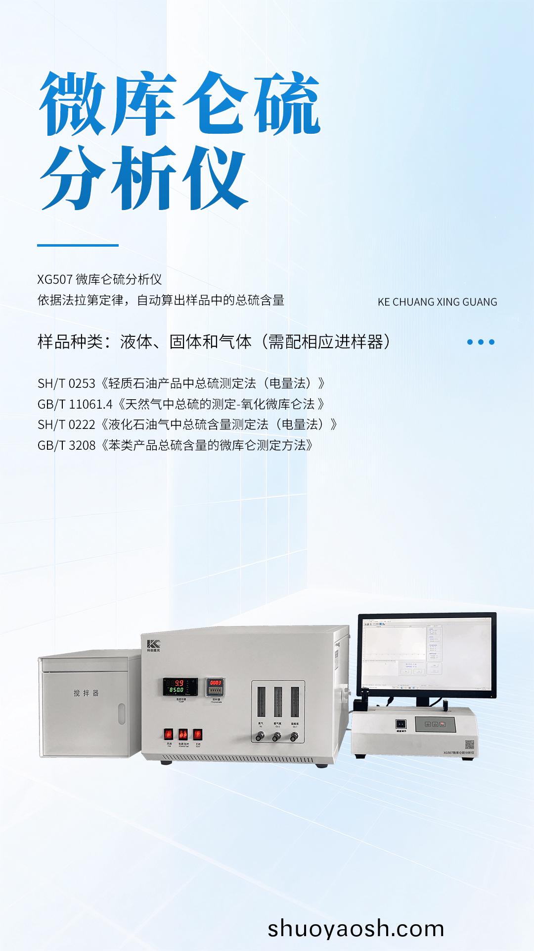 XG507微库仑硫分析仪 根据微库仑原理,样品中各种形态的硫在氮气和氧气中于高温下变成二氧化硫,进入滴定池,通过电解产生碘与二氧化硫反应,微机根据产生的碘消耗的电量,依据法拉第定律,自动算出样品中的总硫含量。整个分析过程由计算机控制,样品由自动进样器载入,仪器自动化程度高。可用于石油化工产品中微量硫的分析,广泛应用于石油、化工、科研、教学、环保、质检、商检等行业。