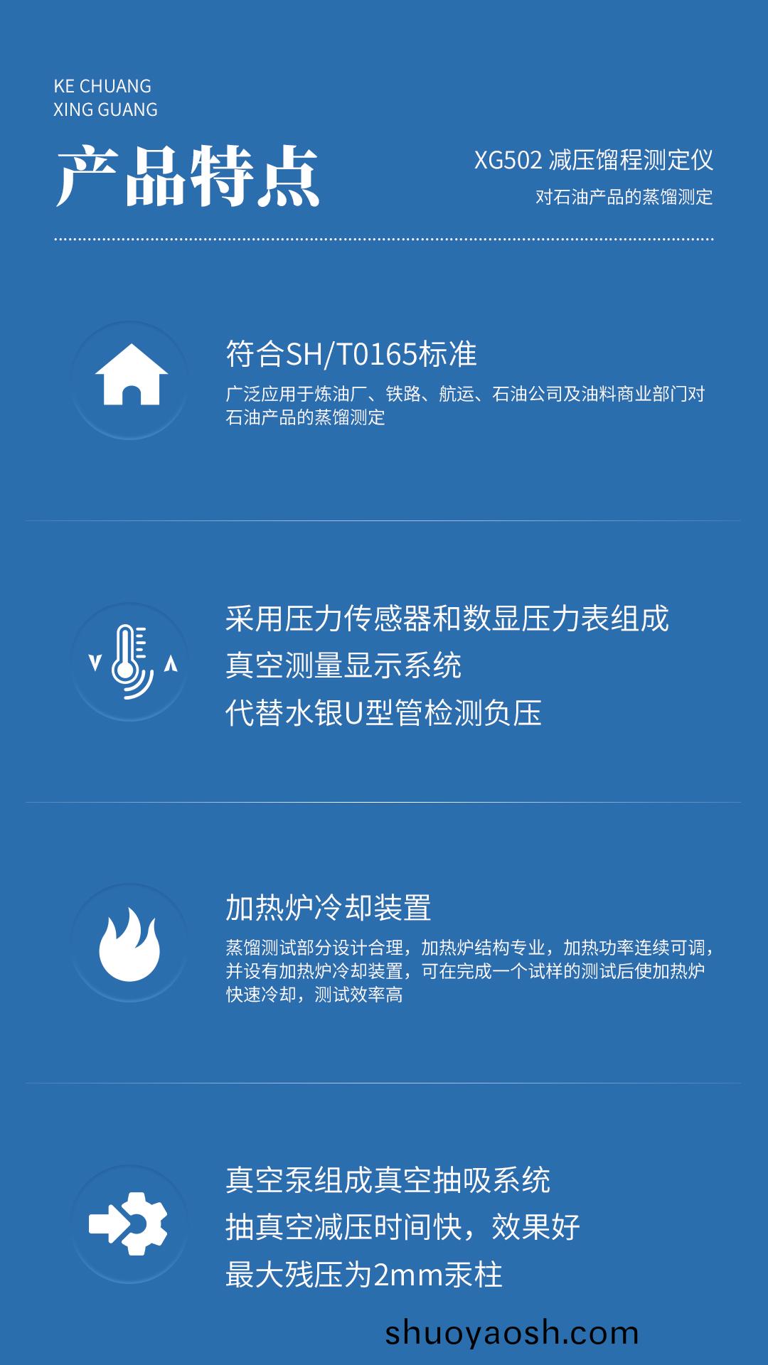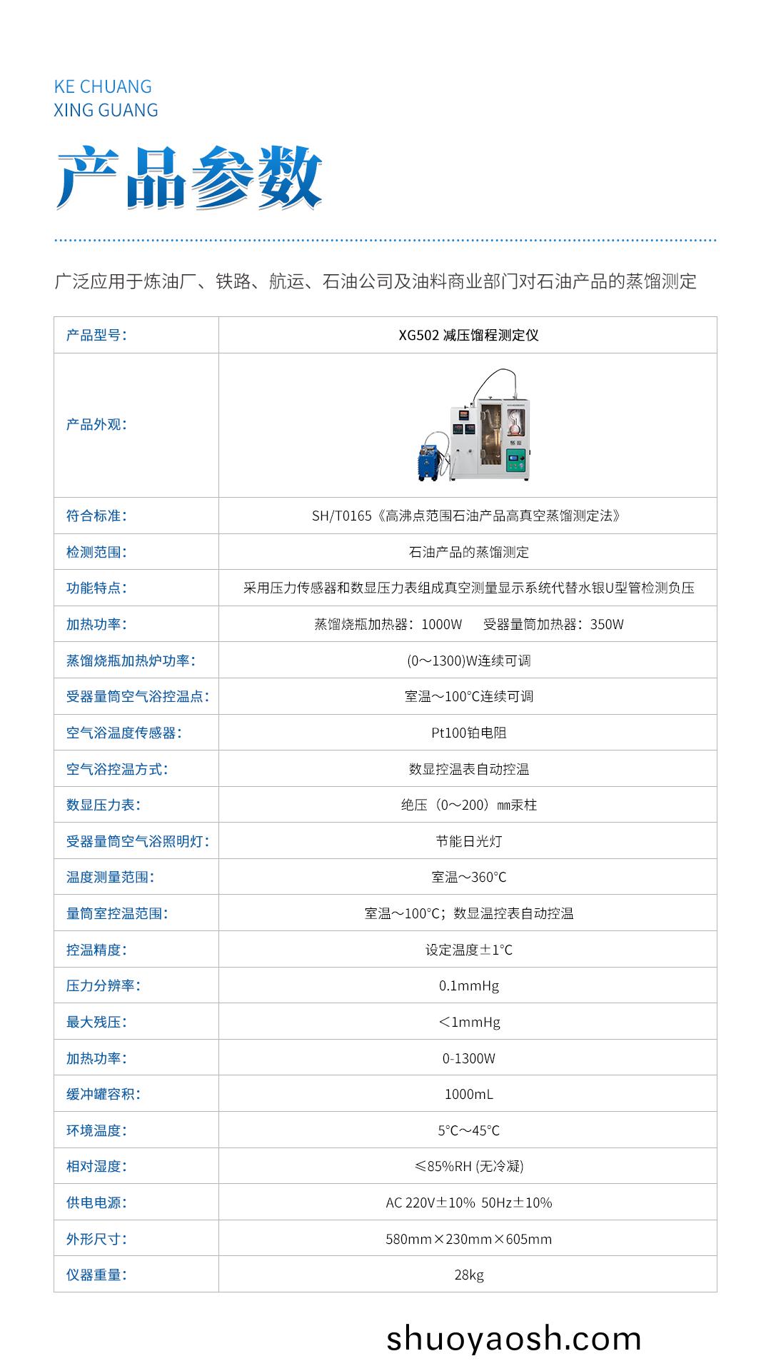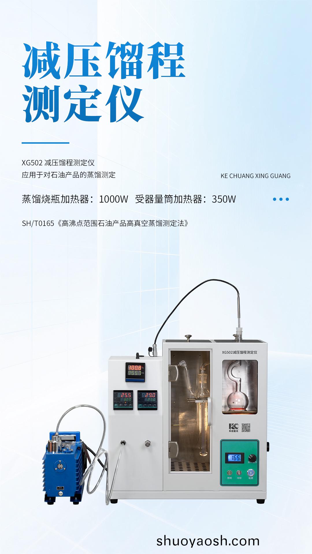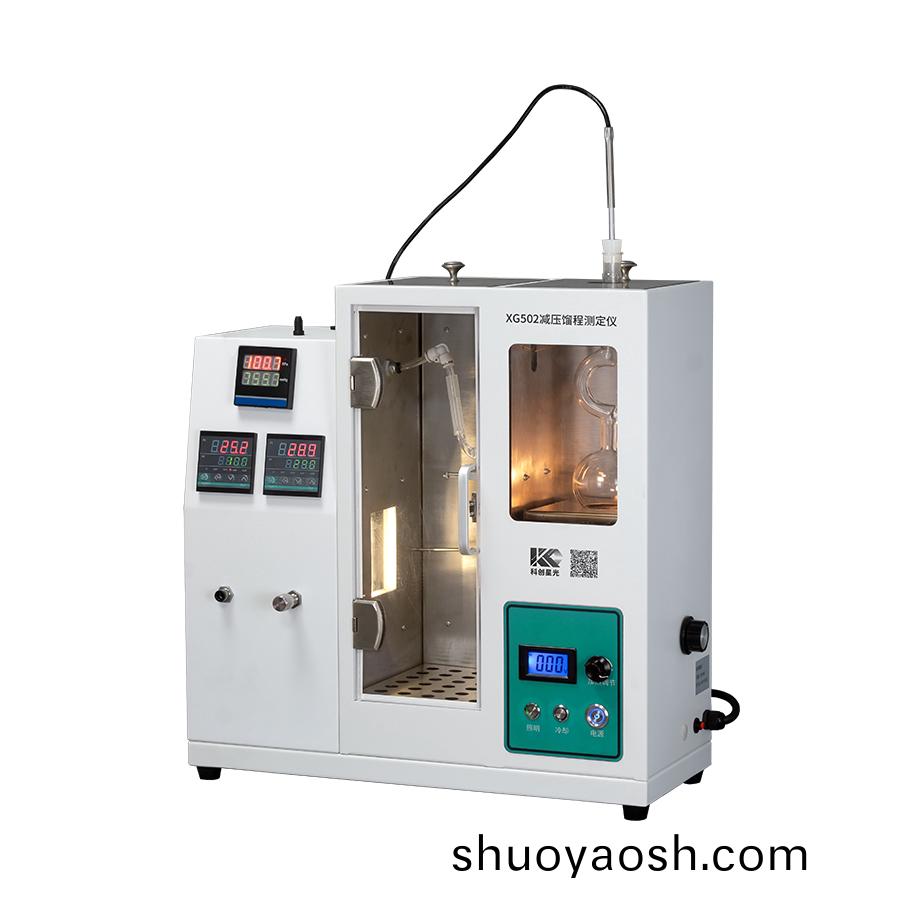 XG502 减压馏程测定仪 符合SH/T0165《高沸点范围石油产品高真空蒸馏测定法》标准,采用压力传感器和数显压力表组成真空测量显示系统代替水银U型管检测负压,外壳采用钣金材质,安装方便,并配有照明灯、连续可调功率加热炉、加热炉冷却装置。广泛应用于炼油厂、铁路、航运、石油公司及油料商业部门对石油产品的蒸馏测定。